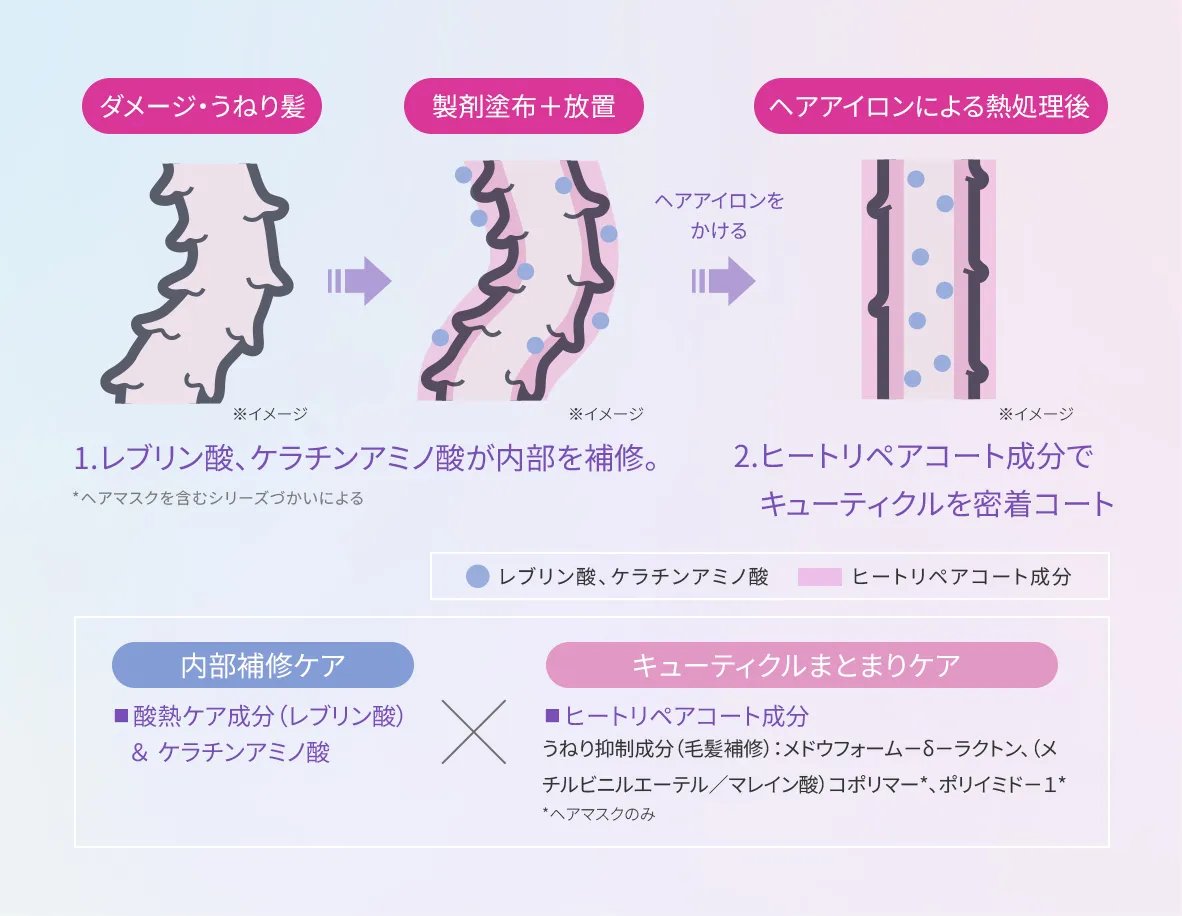 アプローチが重要です。Re:(アールイー)は、髪の内部を補修・補強する酸熱ケア成分*1&ケラチンアミノ酸と、髪表面を熱の力でコートするヒートリペアコート成分*2配合。